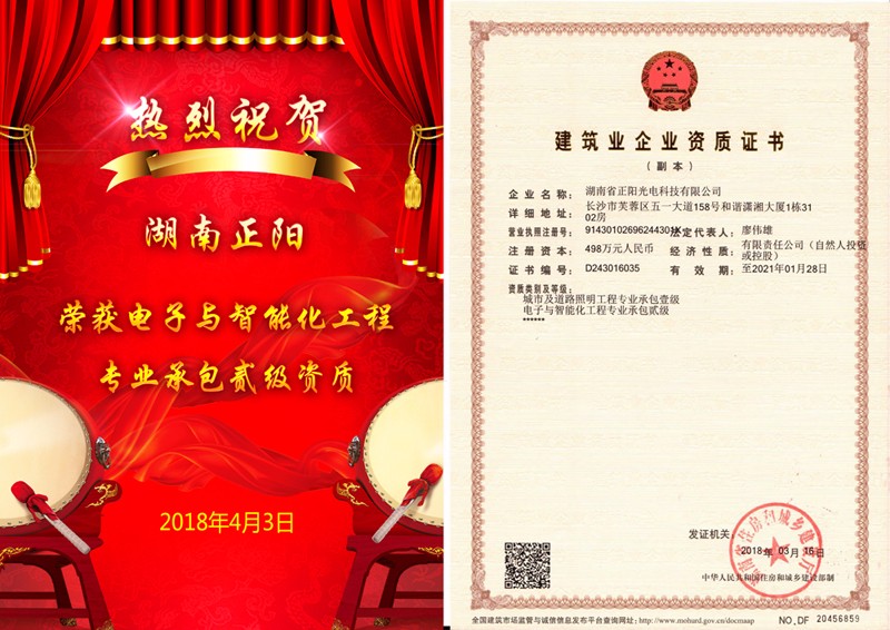 2018年4月3日,經湖南省住房和城鄉建設廳(tīng)批準,湖南桃花视频獲得“電子與智(zhì)能(néng)化工程專業承包貳級資(zī)質”證書。